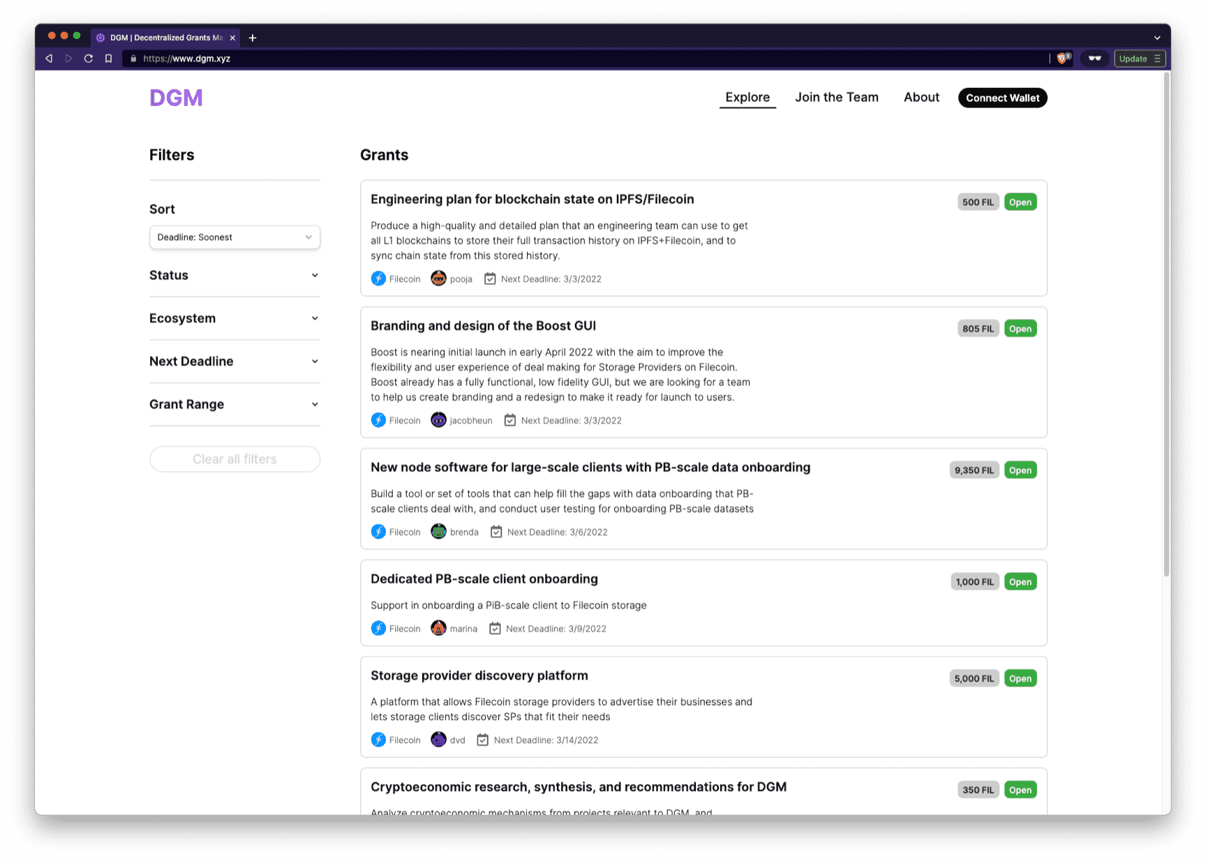 At DGM, we believe that decentralized ecosystems have the potential to achieve unprecedented scale and impact; the goal is to help build the necessary tooling to transform this potential into reality. There are many upcoming features and improvements that will turn the DGM MVP into a full suite of work coordination tools. Some items on the DGM roadmap include building worker/funder reputation systems, more flexible types of funding mechanisms, more ecosystems beyond IPFS and Filecoin (and more currencies), grants DAO/multisig support, skills assessment, incentive models for ongoing maintenance of open-source work, and more.