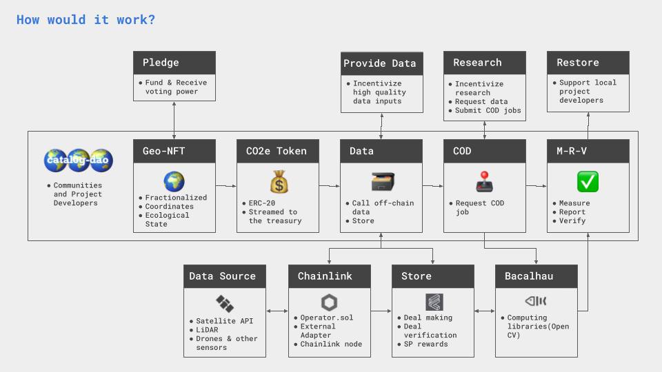 Catalog is a dMRV Data DAO that introduces an incentivized network of regeneration advocates, storage providers, and researchers that work together to support local carbon projects. Catalog aims to allow carbon project developers to procure, store, analyze, and self-govern data with an incentivized dMRV platform.