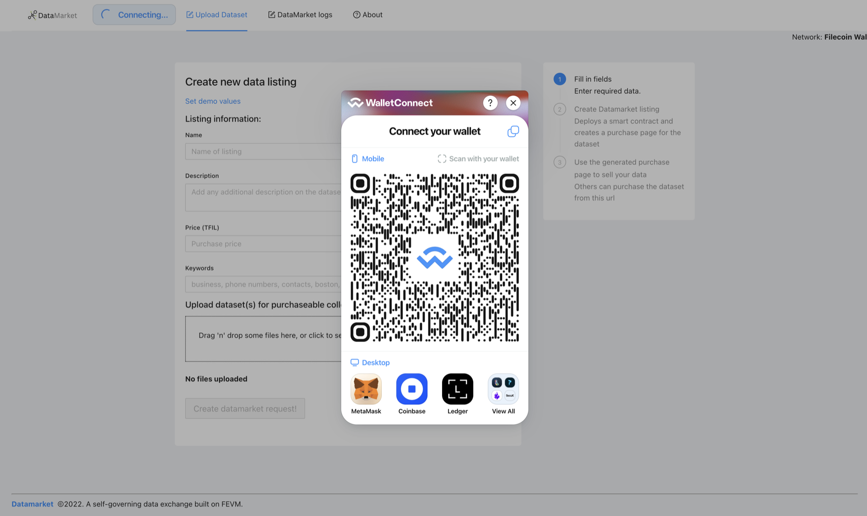 DataMarket is a self-governing, open blockchain platform that allows anyone to create data purchase or checkout pages on the FEVM network. According to the project’s description, “if a bad or inaccurate dataset is uploaded and sold, a purchaser or potential purchaser can flag the dataset as being fraudulent.”