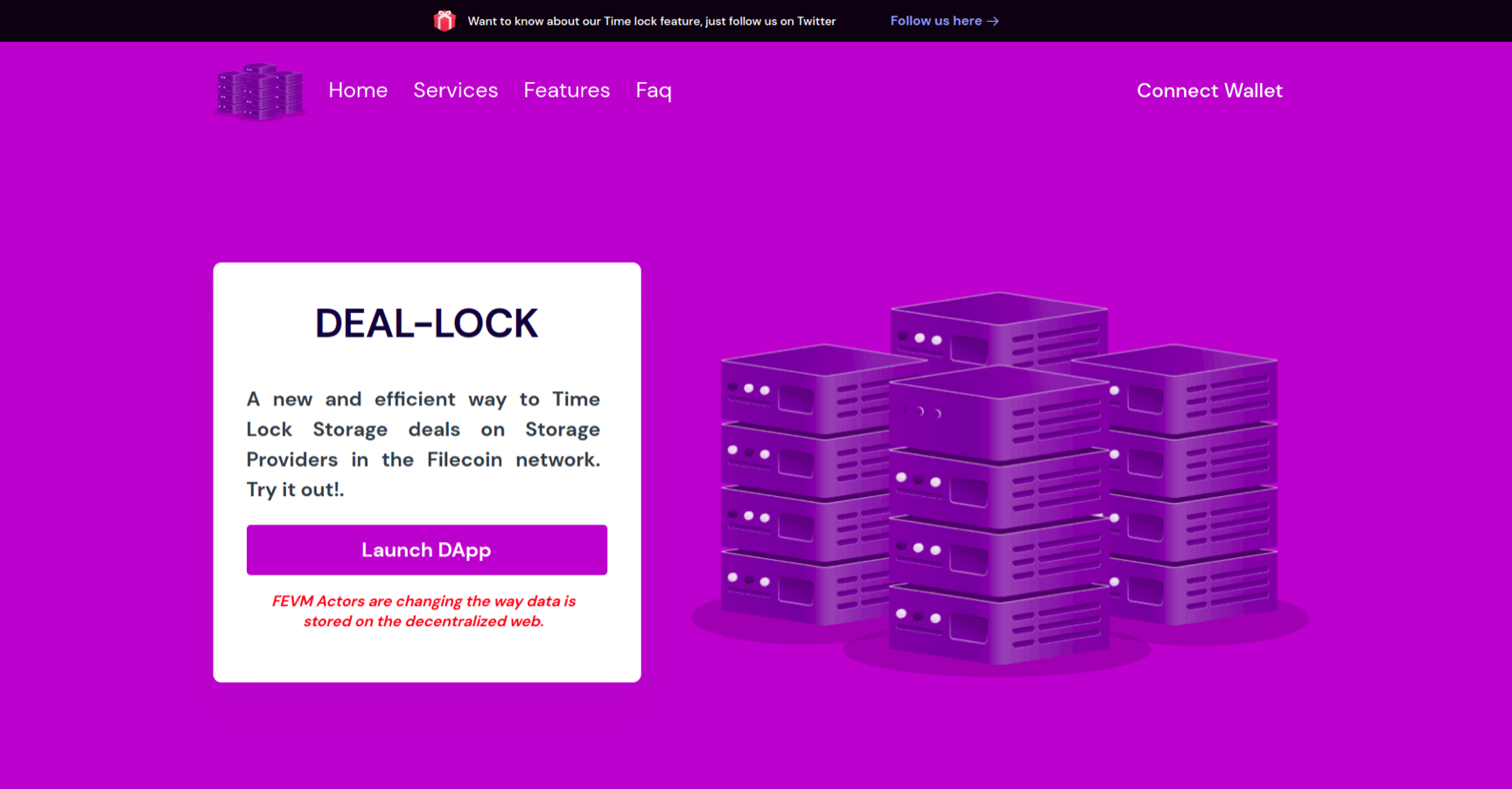 Deal-Lock provides an efficient way to time lock storage deals on storage providers in the Filecoin network. The project will allow users to store and retrieve data from the Filecoin network through deals. Miners and clients interact with each other through storage and retrieval deals. The dapp will pull out variables of any deal once the time lock expires.