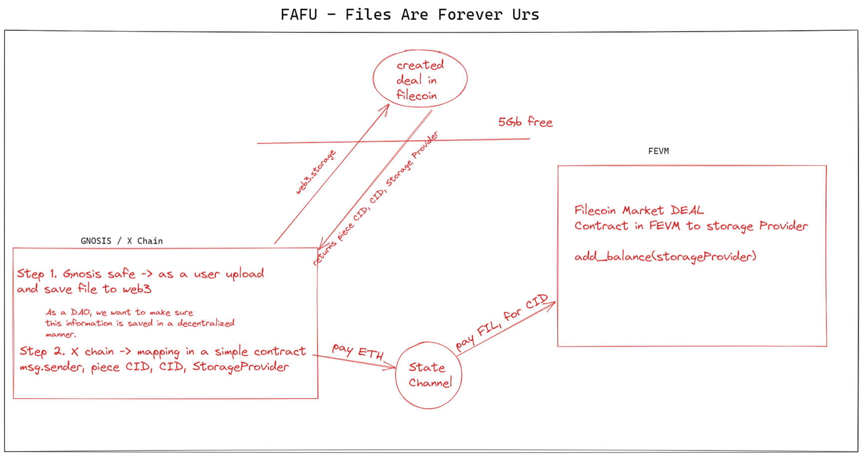 FAFU (Files Are Forever Urs) is a Gnosis SAFE App for safe DAO and multisig file storage. FAFU allows users to save community files on any chain through a storage deal on the fly. The project combines a Gnosis DAO starter UI and FEVM and allows multisig and Zodiac DAO actors to save files in the Filecoin decentralized system.