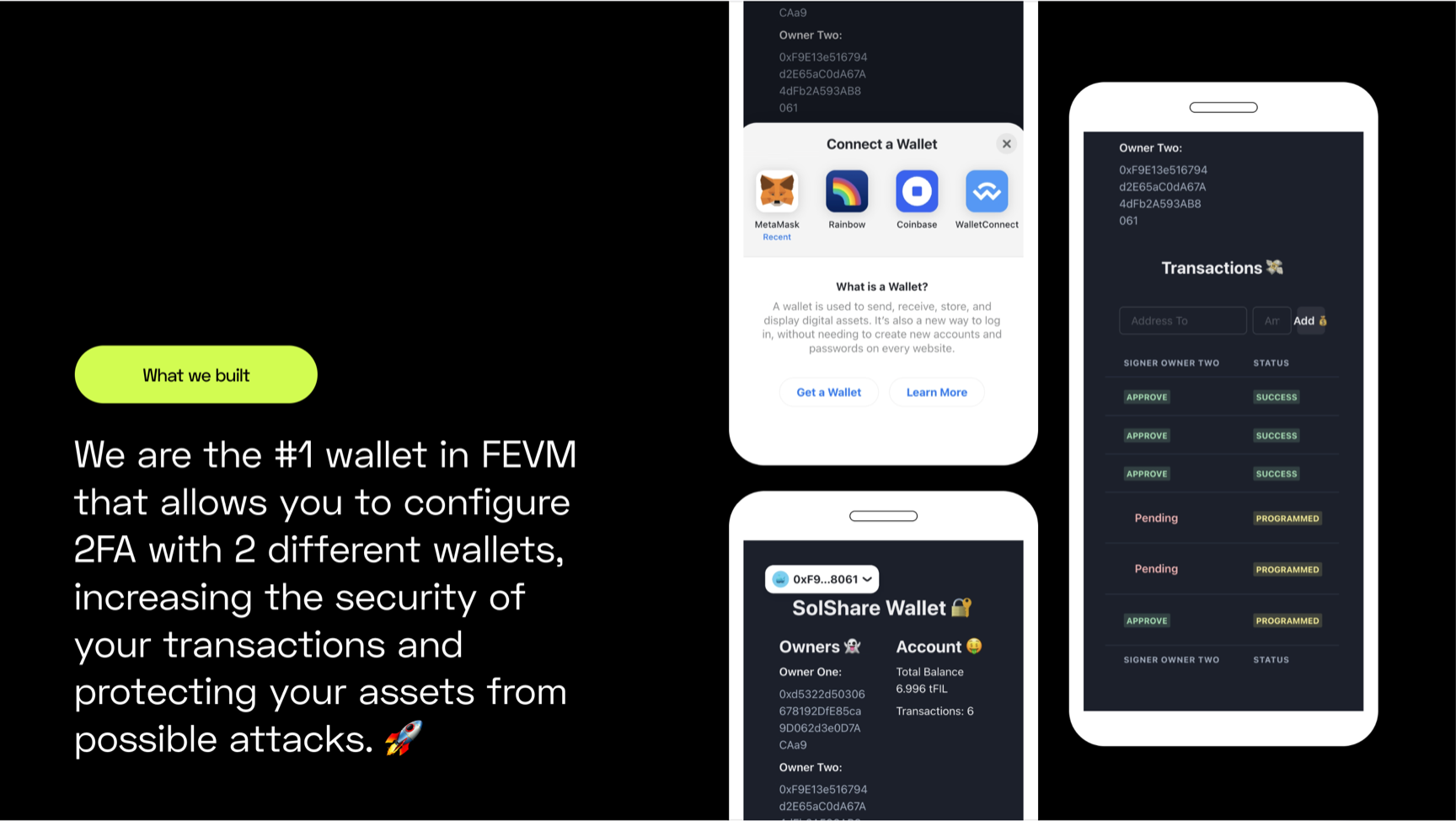 SolShare Wallet allows anyone to configure a double authentication factor (2FA) with two different wallets. This increases the security of transactions and helps defend assets from possible attacks. In the event that one wallet is lost, access will be denied to prevent issues like theft. Additional features include a wallet specifically for hackathons, where each member can register a wallet, and can only withdraw awards after obtaining approval from the team.