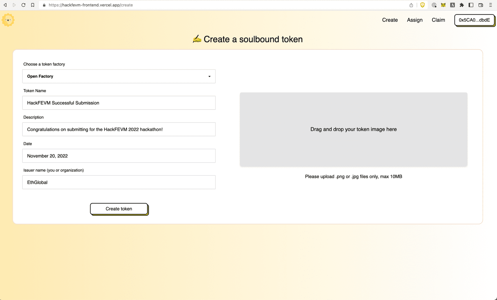 Soulmates is a soulbound token (SBT) issuance engine built on FEVM. It includes a set of FEVM smart contracts, specifically 17 files, 11 test files, and around 500 lines of solidity code. It’s a fully-featured and fully-functioning frontend dapp that can be used to “create, assign, and claim SBTs.”