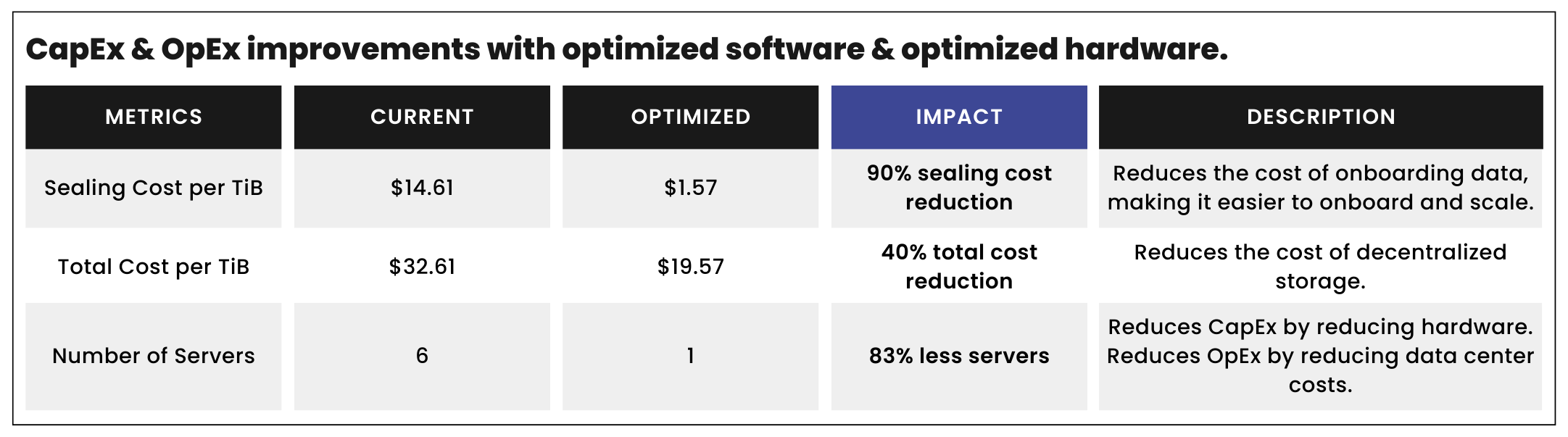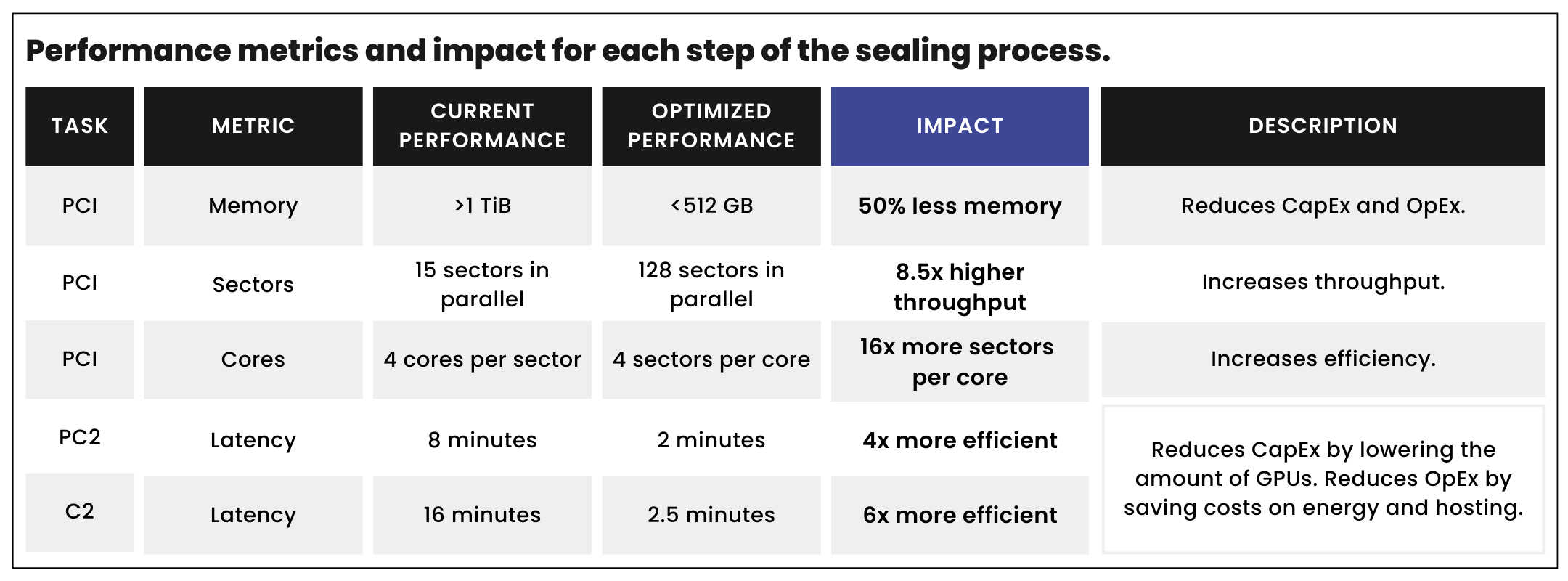 We are pleased to introduce the new software optimizations along with optimized hardware reference configurations. The impact on Storage Providers will vary based on individual hardware and setups; nevertheless, the entire ecosystem can anticipate improved performance and reduced costs with 75-85% increased throughput to PC2 and C2 that will be integrated directly into Lotus. The new optimized software with optimized hardware reduces sealing server costs by up to 90% for Storage Providers, leading to an up to 40% overall cost reduction to decentralized storage. As an example of cost savings, it used to cost over $200,000 to purchase sealing servers to seal 20 TiBs per day. It will now cost under $25,000 to seal 20 TiBs per day. Furthermore, Storage Providers will benefit from a noticeable reduction in operational costs as a single server can now efficiently handle all sealing tasks, achieving a remarkable 6x+ higher throughput.
