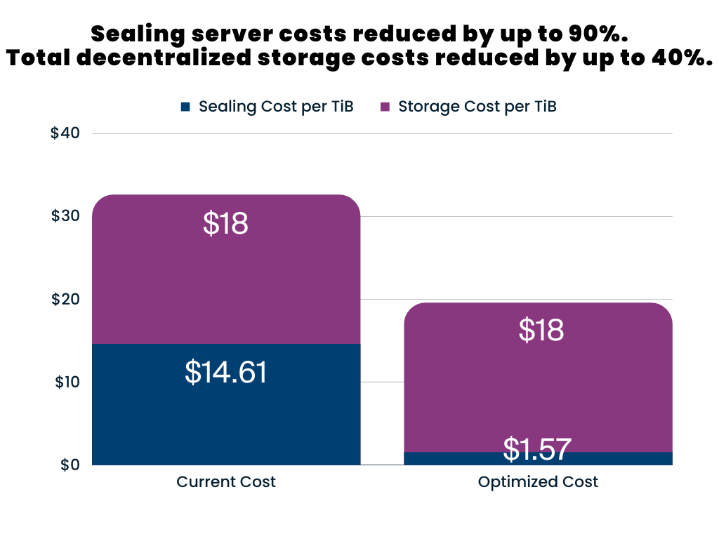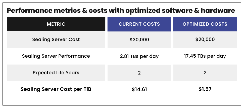 The Filecoin Network relies on computations performed on the data being onboarded in order to ensure network security and enable cryptographic proving, verifiability, and data immutability. However, the hardware required to execute this process, known as “sealing,” often accounts for more than 50% of the total hardware expenses. This poses a challenge for new Storage Providers aiming to join the network and for existing ones seeking to enhance their data onboarding capacity. To address this issue, we are excited to announce the release of new software that optimizes data onboarding for the Filecoin network, resulting in sealing server cost reductions of up to 90%. By leveraging this software, network participants can benefit from decreased compute costs while experiencing increased compute power. Please see below for a breakdown of cost and performance metrics calculations. Although the benchmarks are for CC, we expect to see similar results for non-CC as well.