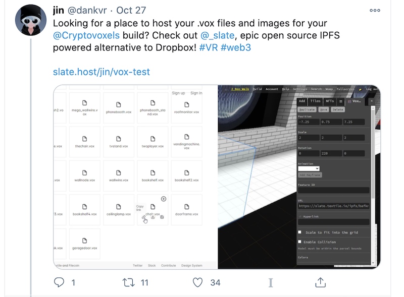 JL: We really care about the Filecoin Retrieval Market. We are working with the team at Textile to make sure we can load an entire IPFS block store into a Textile Bucket. Just imagine, you’ll be able to create a wonderful world of your files on Slate, and then store it on the Filecoin Network for anyone to retrieve. And when they retrieve it, it will appear just as you designed it!