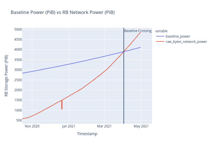 The Network Baseline for Filecoin has crossed the Baseline Target for the first time! This is an important milestone that marks a transition on the path of continued sustainability of the network. This happened at 05:00 UTC on 02 April 2021 — or 00:00 UTC on 21th December 2020 if we measure through the Network Effective Time, which is a key component of why baseline minting is important.