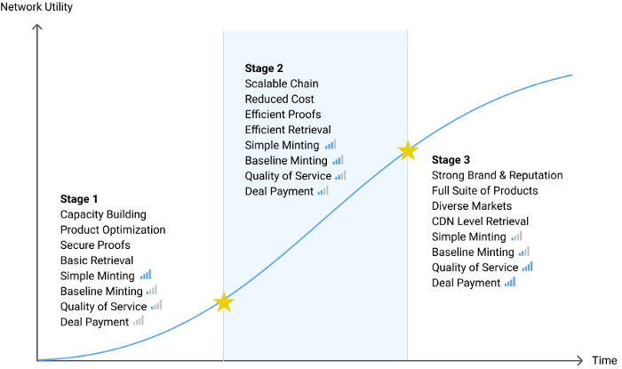 The final transition from Stage 2 to Stage 3 in Figure 2 above will require the involvement of all Filecoin participants, to allow the network to become ever more useful. In this stage, Filecoin becomes a diverse and useful network for goods and services, allowing the large community of participants to consolidate the network’s productivity and efficacy over a long-term perspective.