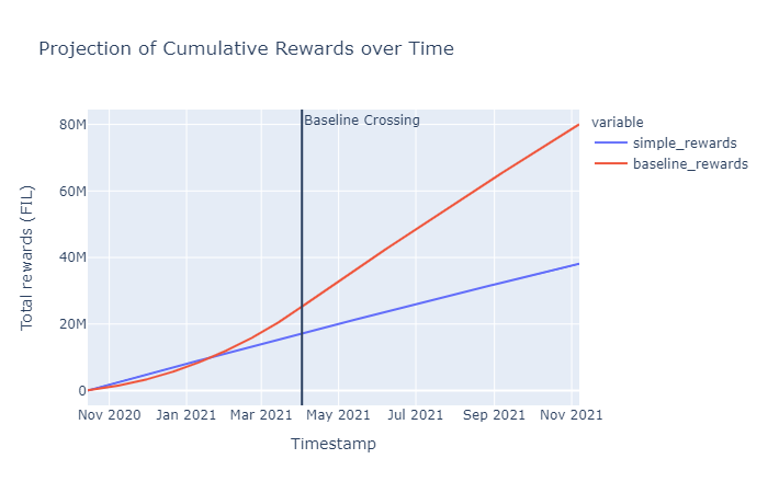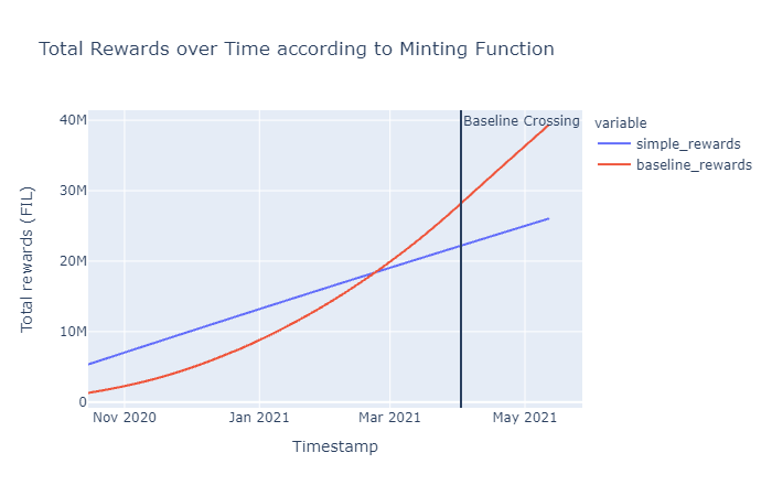 In the following chart, we can observe the cumulative rewards in Filecoin over time with a daily granularity and for both minting functions.