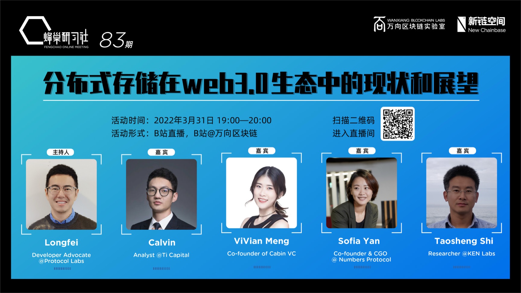 Wanxiang Blockchain Labs is hosting an online panel at 7:00 pm GMT+8, March 31st. Join guests Vivian Meng from Cabin VC, Sofia Yan from Numbers Protocol, Taosheng Shi from Ken Labs and host Longfei along with others from the Filecoin ecosystem. Tune in to watch a livestream of the event in Mandarin.