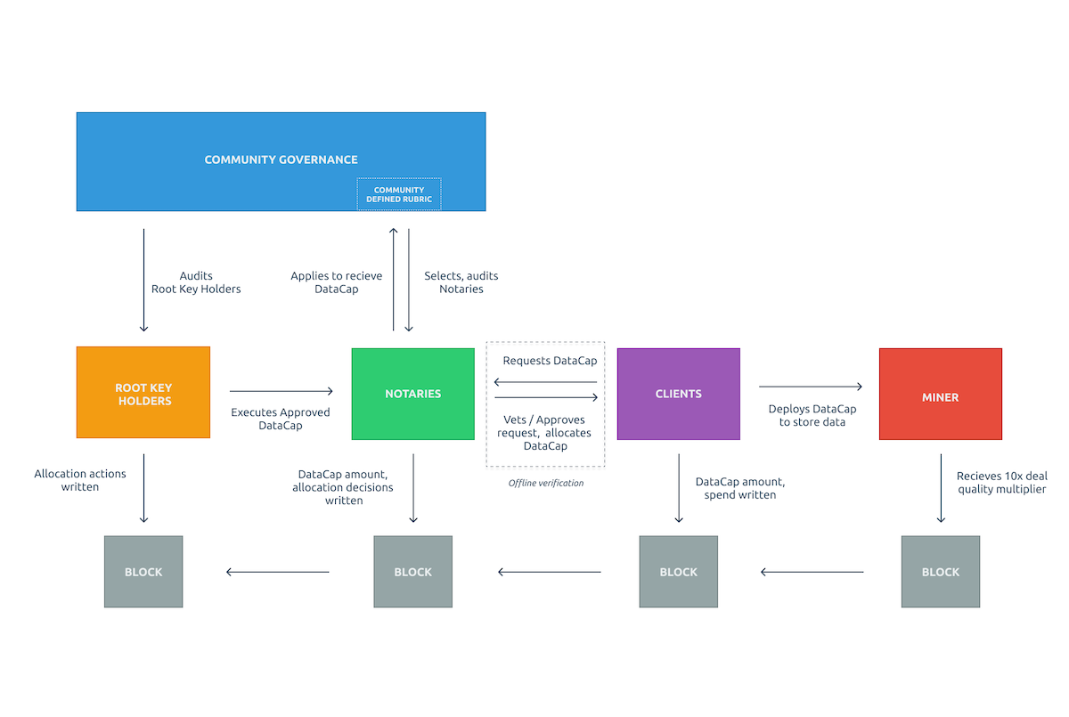 Root Key Holders, Notaries, Clients, and Miners, interact through the allocation and spending of DataCap. DataCap is granted in batches to community-selected Notaries, who in turn, allocate it to trustworthy Clients that spend the DataCap to fund storage deals. Miners that receive DataCap receive a 10x boost to their quality adjusted power for the storage space offered in that deal, which increases their block reward share in the Network. This creates a mechanism that incentivizes all participants to make Filecoin more useful.