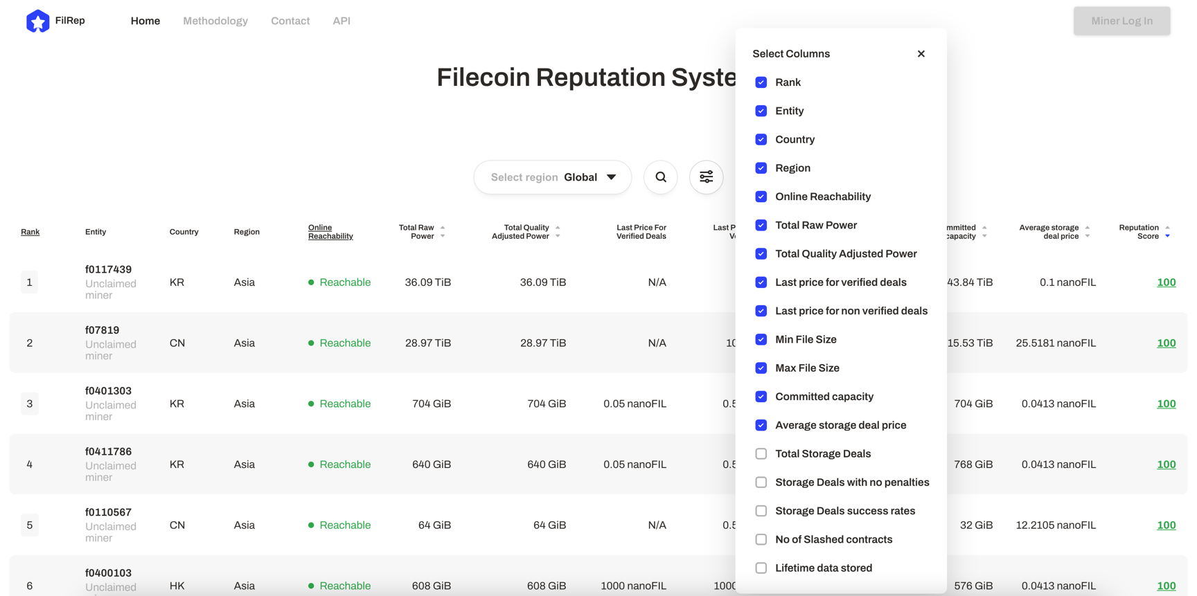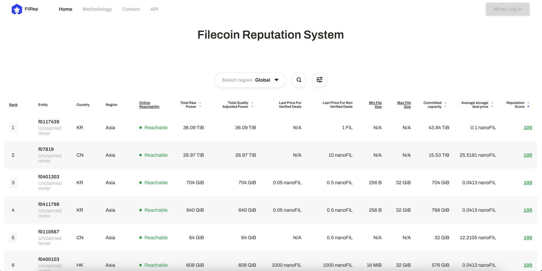 Filrep.io provides all of its data via a public API and a dashboard. The system is designed to cater to all ecosystem participants: developers can use the data provided by the public API to improve miner selection options in their storage clients, miners can use the dashboard to check how they perform in comparison to other miners and gain insight into how to improve their services, and storage clients can use the dashboard to select the best miners for their needs.