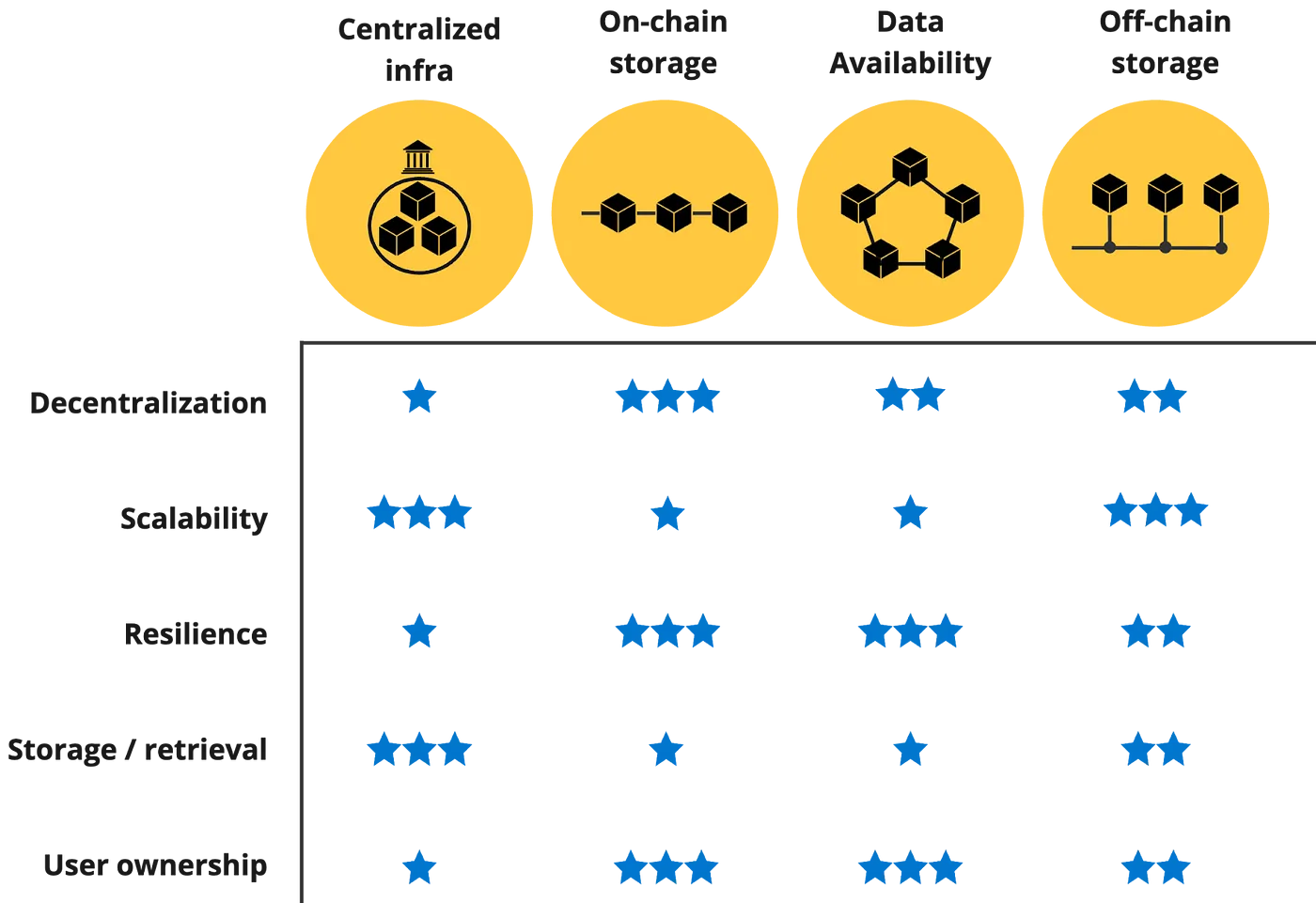 - On-chain storage: Store data directly in chain state, running all data through consensus and retrieving from full nodes in the network, e.g. Solana