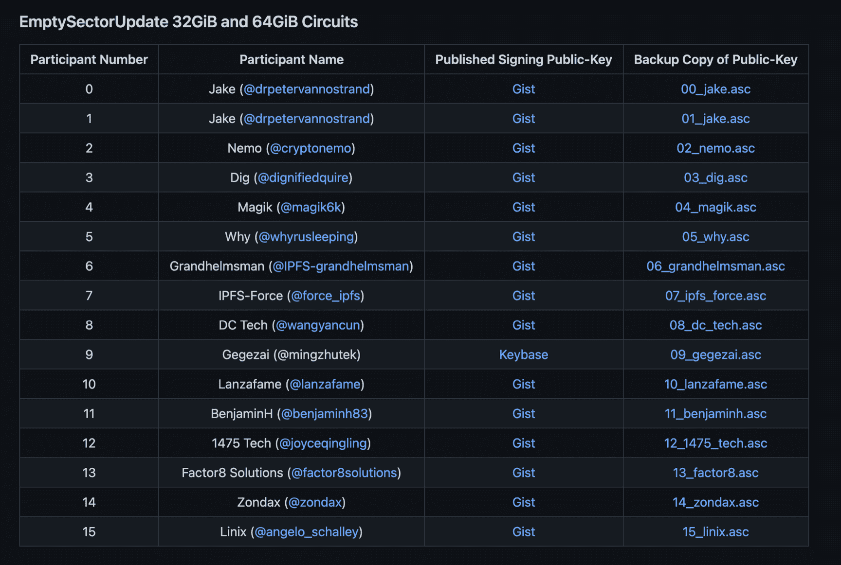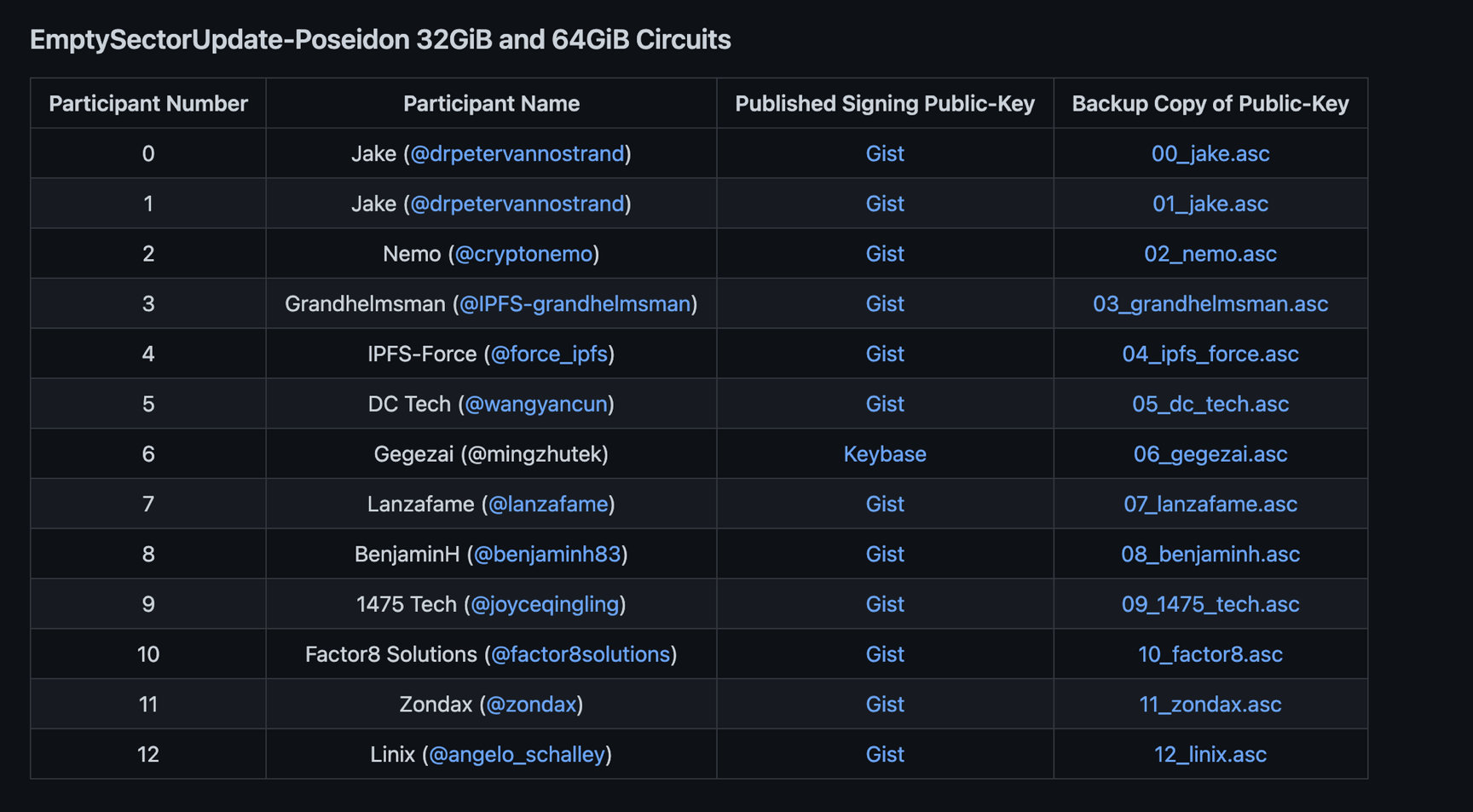 As such, for both ceremonies, we attempted to gather a diverse group of participants – both contributors from within the Filecoin ecosystem, miners with competing interests, as well as individuals and teams from outside in adjacent Web3 communities. In doing so, we aimed to reduce the risk of collusion and increase the probability that at least one contributor per circuit would be deemed sufficiently trustable - thereby guaranteeing the integrity of the output parameters.